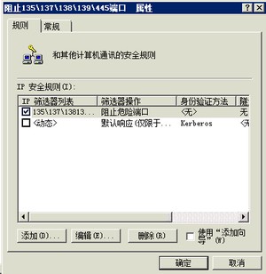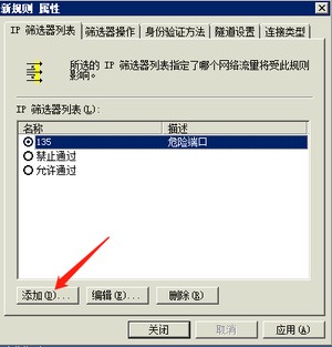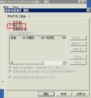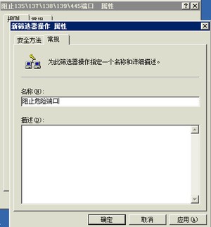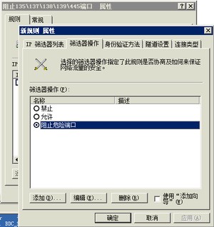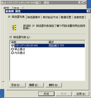 此时,我们选择筛选器列表里的名称为:阻止135/137/138/139/445的单选按钮,在选择筛选器操作里名称为阻止危险端口的单选按钮,点击应用即可。
