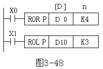 右、左循环移位指令(D)ROR(P)和(D)ROL(P)编号分别为FNC30和FNC31。执行这两条指令时,各位数据向右(或向左)循环移动n位,最后一次移出来的那一位同时存入进位标志M8022中,如图1所示。
