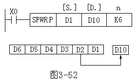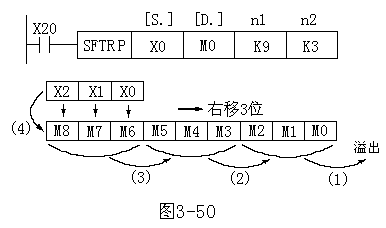 先入先出读出指令SFRD,当X0由OFF变为ON时,D2中的数据送到D20,同时指针D1的值减1,D3~D9的数据向右移一个字,数据总是从D2读出,指针D1为0时,不再执行上述操作且M8020置1。