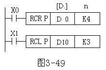 带进位的循环右、左移位指令(D) RCR(P)和(D) RCL(P)编号分别为FNC32和FNC33。执行这两条指令时,各位数据连同进位(M8022)向右(或向左)循环移动n位,如图2所示。
