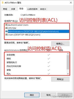 Windows的访问控制列表(Access Control List):访问权限决定着某个用户可以访问的文件和目录 对于每一个文件和文件夹,由安全描述符(SD)规定了安全数据、安全描述符决定安全设置是否对当前目录有效,或者它可以被传递给其他文件和目录。