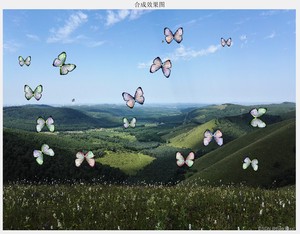 有一幅蝴蝶、一幅风景图片,基于几何、代数和色彩通道运算,编程实现漫天蝴蝶飞舞的合成图像。