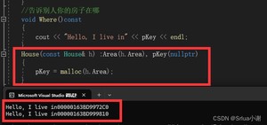 我们要效果是,你的朋友要的是和你有一样的房子,而不是同一个,所以我们自定义一个拷贝构造函数,这时的运行结果显示,两套房子的地址不一样了~这就是深拷贝!