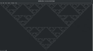 在标准的 80x24 终端运行这个 程序并没什么意思。在那样的分辨率下你不能看见谢尔宾斯基三角形的很多细节。如果你运行终端窗口并设置非常小的字体大小,你可以更加容易地看到谢尔宾斯基三角形的不规则性质。在我的系统上,输出如图 1。