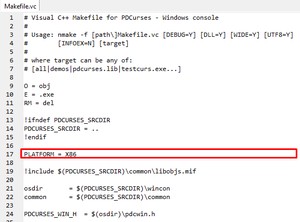 看了 sunny_老王 的 文章,在 Makefile.vc 编译脚本的开头部分插入“PLATFORM = X86”,如下图所示。