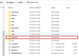 当前最新稳定版为3.9版(2019年9月5日发布)。下载名称为 3.9 的Tag压缩文件并解压,即可得到3.9版的PDCurses源代码。进入wincon目录,Makefile.vc 即用于Visual C++编译的脚本。