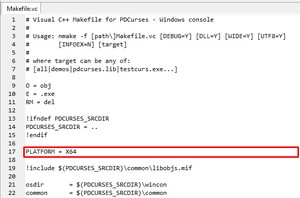 在 Makefile.vc 编译脚本的开头部分插入“PLATFORM = X64”,如下图所示。
