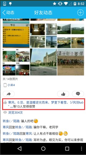 2)实现部分可点击的TextView 相信玩过空间和微信朋友圈的朋友对下面的东东并不陌生吧,我们可以点击 对应的用户然后进入查看用户相关的信息是吧!