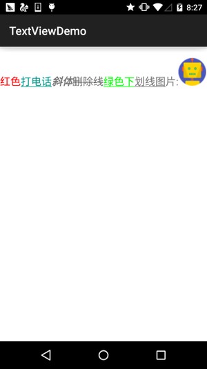 SpannableString span = new SpannableString("红色打电话斜体删除线绿色下划线图片:.");