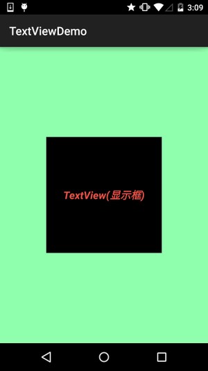 <RelativeLayout xmlns:android="http://schemas.android.com/apk/res/android" xmlns:tools="http://schemas.android.com/tools" android:layout_width="match_parent" android:layout_height="match_parent" tools:context=".MainActivity" android:gravity="center" android:background="#8fffad"> <TextView android:id="@+id/txtOne" android:layout_width="200dp" android:layout_height="200dp" android:gravity="center" android:text="TextView(显示框)" android:textColor="#EA5246" android:textStyle="bold|italic" android:background="#000000" android:textSize="18sp" /> </RelativeLayout>