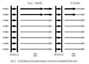 图1.3 描述了由于年轻代垃圾收集(黑色箭头)、CMS 初始标记,重新标记阶段以及老年代垃圾收集stop-the-world 阶段,导致Java 应用线程被暂停。CMS 垃圾收集器的老年代收集活动从一个stop-the-world 的初始标记阶段开始。一旦完成初始标记,就进入并发标记阶段,在这个阶段允许Java 应用线程和CMS 标记线程同时执行。图1.3 中,在“标记/预清理”标签下方,前两个比较长的黑色箭头就是并发标记线程。一旦并发标记完成,CMS线程就执行并发预清理,即图中“标记/预清理”标签下方两个较短的黑色箭头。需要注意的是,如果有足够的可用硬件线程,CMS 线程的执行成本并不会对Java 应用线程的性能产生太大影响。但如果硬件线程是饱和的或被高度利用的,CMS 线程就会和Java 应用线程竞争CPU 周期。一旦并发预清理完成,stop-the-world 的重新标记阶段就会开始。在重新标记阶段会标记初始标记、并发标记以及并发预清理过程中可能错过的对象。当重新标记阶段结束后,并发清除启动,释放所有死亡对象的空间。