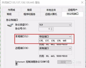 14、点击“协议和端口”,可以看到阻止连接的本地端口是之前设置的135,137,138,139,445,说明网络端口135,137,138,139,445已经阻止连接