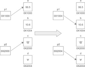 也就是说,定义指针变量时必须带,给指针变量赋值时不能带。假设变量 a、b、c、d 的地址分别为 0X1000、0X1004、0X2000、0X2004,下面的示意图很好地反映了 p1、p2 指向的变化: