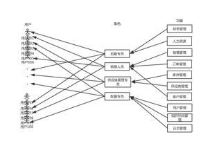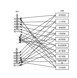 企业A一共有12个功能,需要创建100个用户,这些用户中有管财务的、有管人事的、有管销售的等等。如果不引入RBAC模型,我们需要每创建一个用户就要分配一次功能,至少(每个用户只有一个功能)操作100次,如果人数增加到1000甚至10000,并且一个用户可能会有多个功能的时候,操作会非常繁琐,如图:
