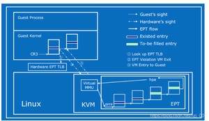 EPT(extended page table)可以看做一个硬件的影子页表,在Guest中通过增加EPT寄存器,当Guest产生了CR3和页表的访问的时候,由于对CR3中的页表地址的访问是GPA,当地址为空时候,也就是Page fault后,产生缺页异常,如果在软件模拟或者影子页表的虚拟化方式中,此时会有VM退出,qemu-kvm进程接管并获取到此异常。但是在EPT的虚拟化方式中,qemu-kvm忽略此异常,Guest并不退出,而是按照传统的缺页中断处理,在缺页中断处理的过程中会产生EXIT_REASON_EPT_VIOLATION,Guest退出,qemu-kvm捕获到异常后,分配物理地址并建立GVA->HPA的映射,并保存到EPT中,将EPT载入到MMU,下次转换时候直接查询根据CR3查询EPT表来完成GVA->HPA的转换。以后的转换都由硬件直接完成,大大提高了效率,且不需要为每个进程维护一套页表,减少了内存开销。