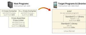 在host服务器上安装了c和c++的交叉编译工具链(假定目标系统是aarch64的系统),编译过程中会将c或者c++程序先编译成汇编临时文件,然后依赖本地的汇编器as编译成目标文件,再用链接器ld链接生成可执行文件,但这个可执行文件的格式是按目标系统来构建的,所以在host服务器上无法运行。