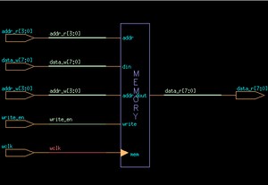 双口RAM设计较为简单,主要为生成一块memory,将写数据写入写地址对应内存空间,从读地址对应内存空间读取读数据,原理图如下: