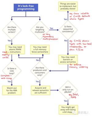 无锁编程详细使用和考虑到的技术方法包含:原子操作(atomic operations), 内存栅栏(memory barriers), 内存顺序冲突(memory order)。 指令序列一致性(sequential consistency)和顺ABA现象等等。这方面借用一篇资料的总结的图概况: