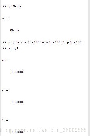 g = f; % g也是函数句柄,其“值”和f一样,都代表sin函数