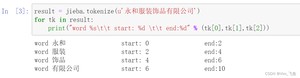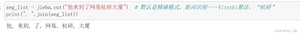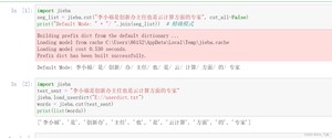 在jieba自定义字典方面,目前我所了解到的常见的应用环境是各网络平台对违禁词的查询搜索处理,以及网站也对用户个人信息的处理,对购物方面评价信息的处理等等。因此,我同样也使用了jupyter notebook尝试了自定义词典的使用,text文本文件及运行结果如下图所示: