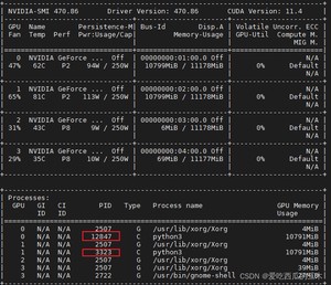 最左边的0123表示四块显卡,中间的Memory—Usage表示每块显卡的使用情况,例如现在GPU2是空闲的,013都在跑东西,又或者直接看下面的Processes,发现013都有程序在跑,2没有,我们就可以用GPU2来跑程序了。