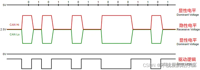 在CAN总线上,利用CAN_H和CAN_L两根线上的电位差来表示CAN信号。CAN 总线上的电位差分为显性电平(Dominant Voltage)和隐性电平(Recessive Voltage),其中显性电平为逻辑 0,隐性电平为逻辑 1。