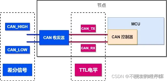 CAN总线通过差分信号进行数据传输,CAN收发器将差分信号转换为TTL电平信号,或者将TTL电平信号转换为差分信号,CAN控制器将TTL电平信号接收并传输给MCU,如下图所示: