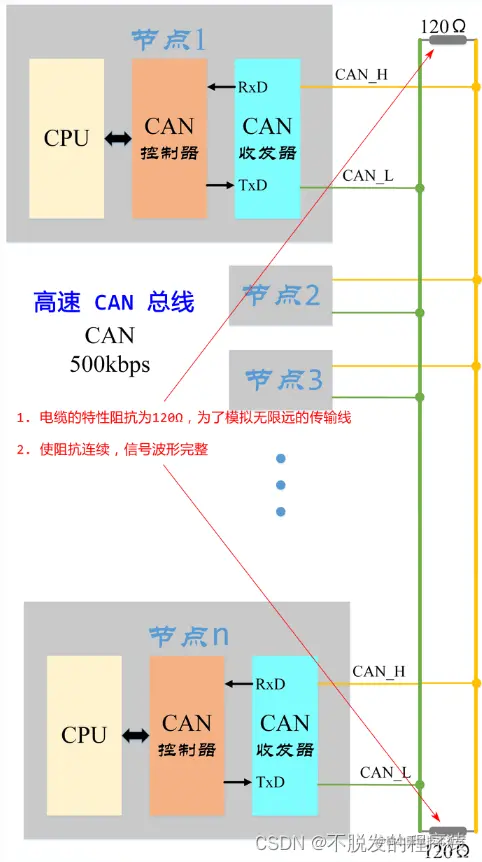 - 理论上,CAN总线用单根信号线就可以通信,但还是配备了第二根导线,第二根导线与第一根导线信号为差分关系,可以有效抑制电磁干扰;