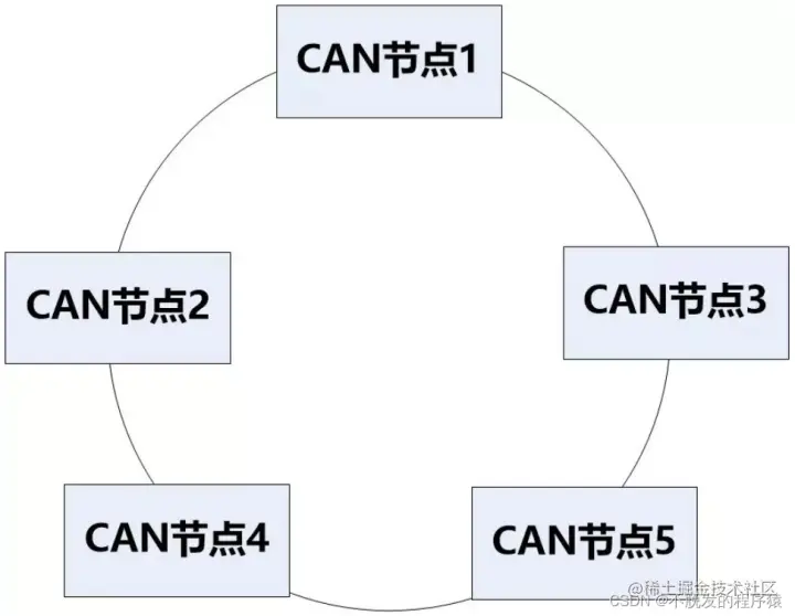 环形拓扑是将CAN总线头尾相连,形成环状,其优点是线缆任意位置断开,总线都不会出现问题,缺点是信号反射严重,无法用于高波特率和远距离传输,如下图所示: