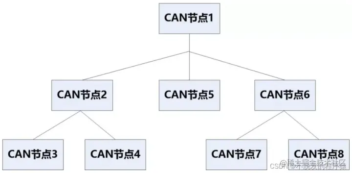 CAN总线是一种广播类型的总线,可支持线形拓扑、星形拓扑、树形拓扑和环形拓扑等。CAN网络中至少需要两个节点设备才可进行通信,无法仅向某一个特定节点设备发送消息,发送数据时所有节点都不可避免地接收所有流量。但是,CAN总线硬件支持本地过滤,因此每个节点可以设置对有效的消息做出反应。