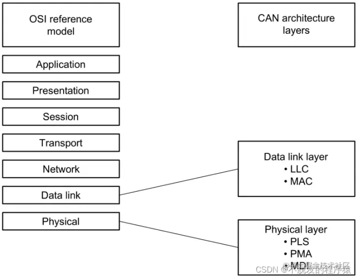 CAN通讯协议标准(ISO-11898:2003)介绍了设备间信息是如何传递以及符合开放系统互联参考模型(OSI)的哪些分层项。实际CAN通讯是在连接设备的物理介质中进行,物理介质的特性由模型中的物理层定义。ISO11898体系结构定义七层,OSI模型中的最低两层作为数据链路层和物理层,如下图所示:
